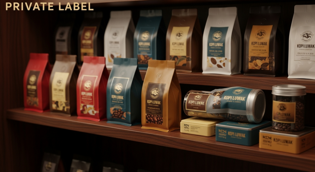Premium Kopi Luwak and specialty Indonesian coffee under your brand name—custom packaging, label design, gift sets, and complete logistics